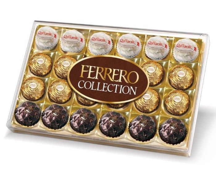 Бонбони Ferrero Rocher представляват изкушаваща комбинация от сочен шоколадов крем, прегърнал цял лешник и хрупкава вафла, и залят с млечен шоколад с фино нарязани лешници. Бонбоните Raffaello са хармонично съчетание от внимателно подбрани калифорнийски бадеми и тихоокеански кокос. А Ferrero Rondnoir са фини шоколадови бонбони с интезивен тъмен шоколад, хрупкава вафла, и шоколадов крем с перла натурален шоколад по средата.